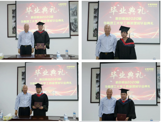新合鋁業(yè)·華南理工大學(xué)2020屆工商管理班畢業(yè)典禮于8月10號(hào)在新合鋁業(yè)新興公司隆重舉行,經(jīng)過(guò)近三年的學(xué)習(xí),公司40位員工完成全部學(xué)業(yè)獲得畢業(yè)證書(shū)!在畢業(yè)典禮當(dāng)天,大家興高采烈地穿上了學(xué)士服,公司董事長(zhǎng)李董、總經(jīng)理潘總、財(cái)務(wù)總監(jiān)馮總等公司管理層領(lǐng)導(dǎo)出席畢業(yè)典禮。