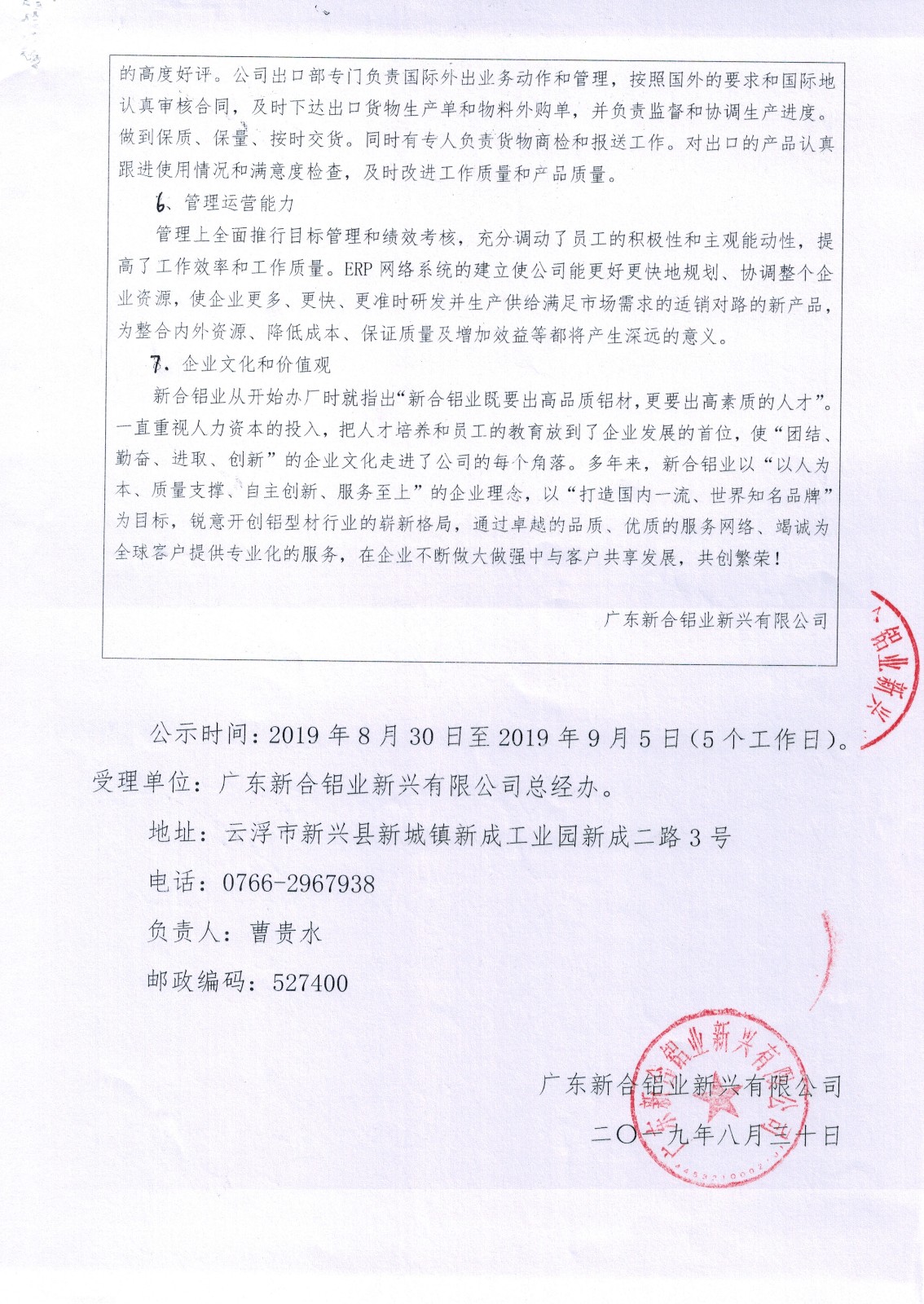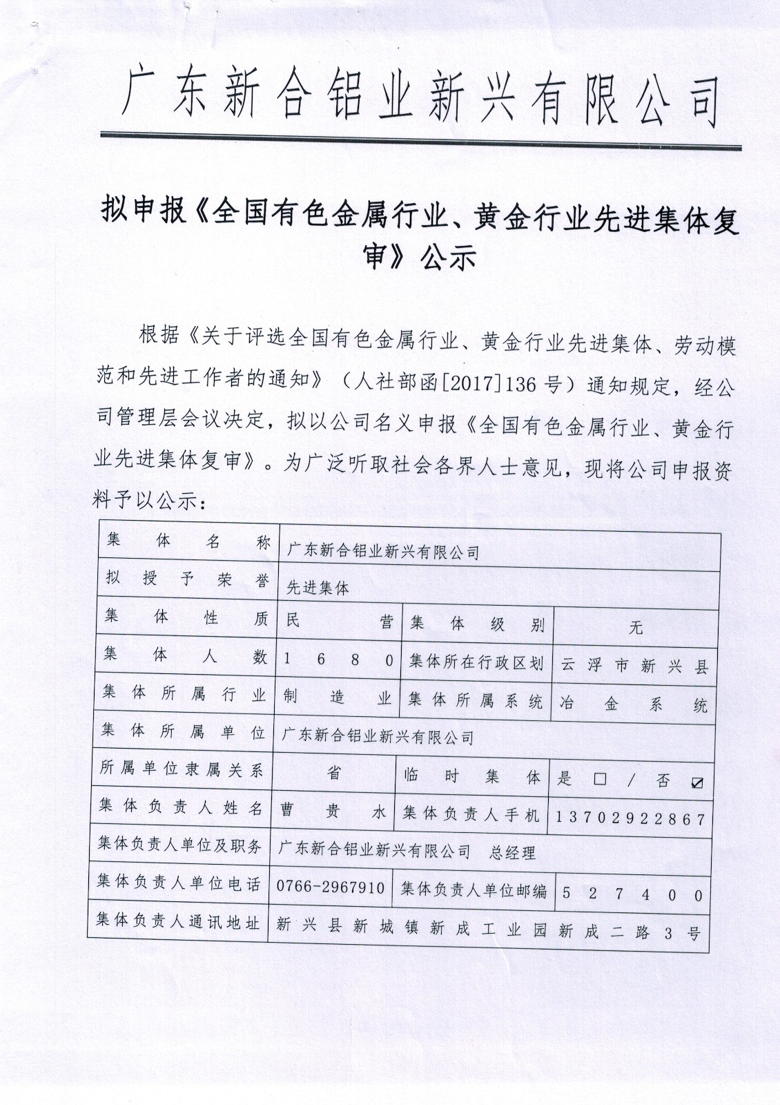 廣東新合鋁業(yè)新興有限公司擬申報(bào)《全國(guó)有色金屬行業(yè)、黃金行業(yè)先進(jìn)集體復(fù)審》公示